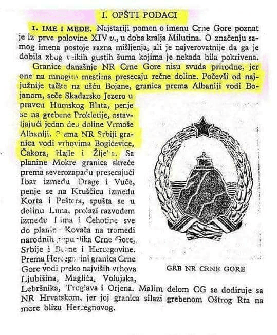 “The borders of today’s People’s Republic of Montenegro are not always natural, as they intersect river valleys in many places. Starting from the southernmost point at the mouth of the Bojana River, the border towards Albania runs along the Bojana River, crosses Lake Skadar in the direction of Humski Blato, climbs the ridges of the Prokletije Mountains, leaving one tenth of the Vrmoša Valley to Albania. Along the People’s Republic of Serbia, the border runs along the peaks of Bogićevica, Čakor, Hajla and Žljeb”