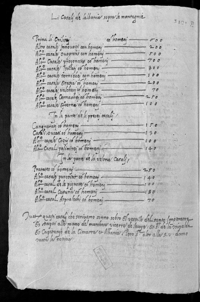 A letter sent from Himara, Albania, in 1532, addressed to the representative of the Spanish imperial power, the Marquis of Atripalda, captain of Himara and Arbëria, provides an insightful glimpse into the military organization of the region during the period. This letter emphasizes the Cimarra-Albanian origin and includes a register detailing the names of villages across different regions, along with the number of men capable of serving as soldiers that each village could contribute, as documented in the original text.