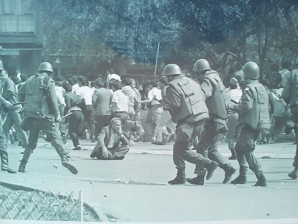 Albanian peaceful protester sits cross-legged as Serbian riot police attack Albanian civilians.
