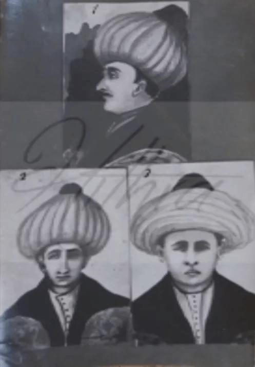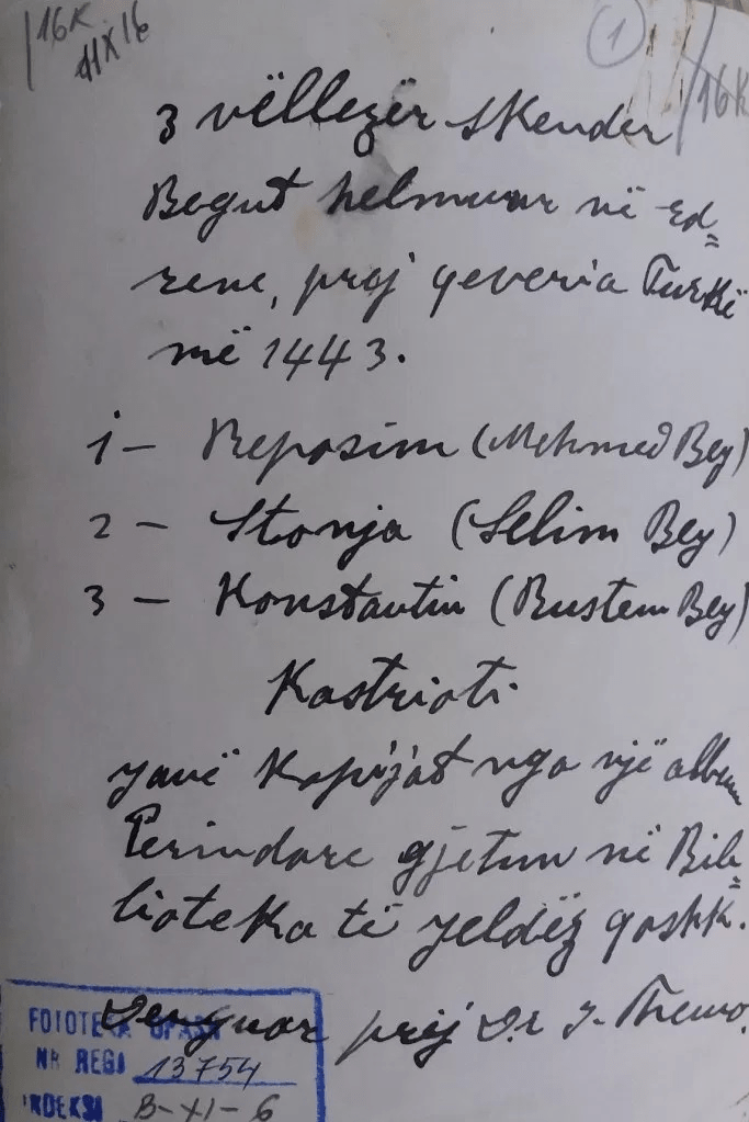 On the back it states “The three brothers of Skanderbeg who were poisoned in Edtine by the Turkish Government in 1443, the so-called Reposhi (Mehmet Bey), Stonja (Selim Bey) and Konstantini (Rrustem Bey) Kastrioti.