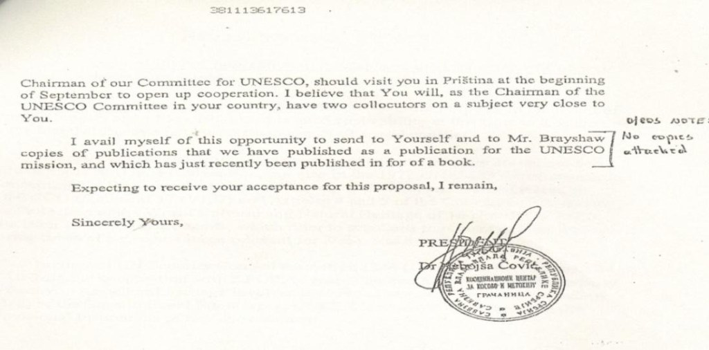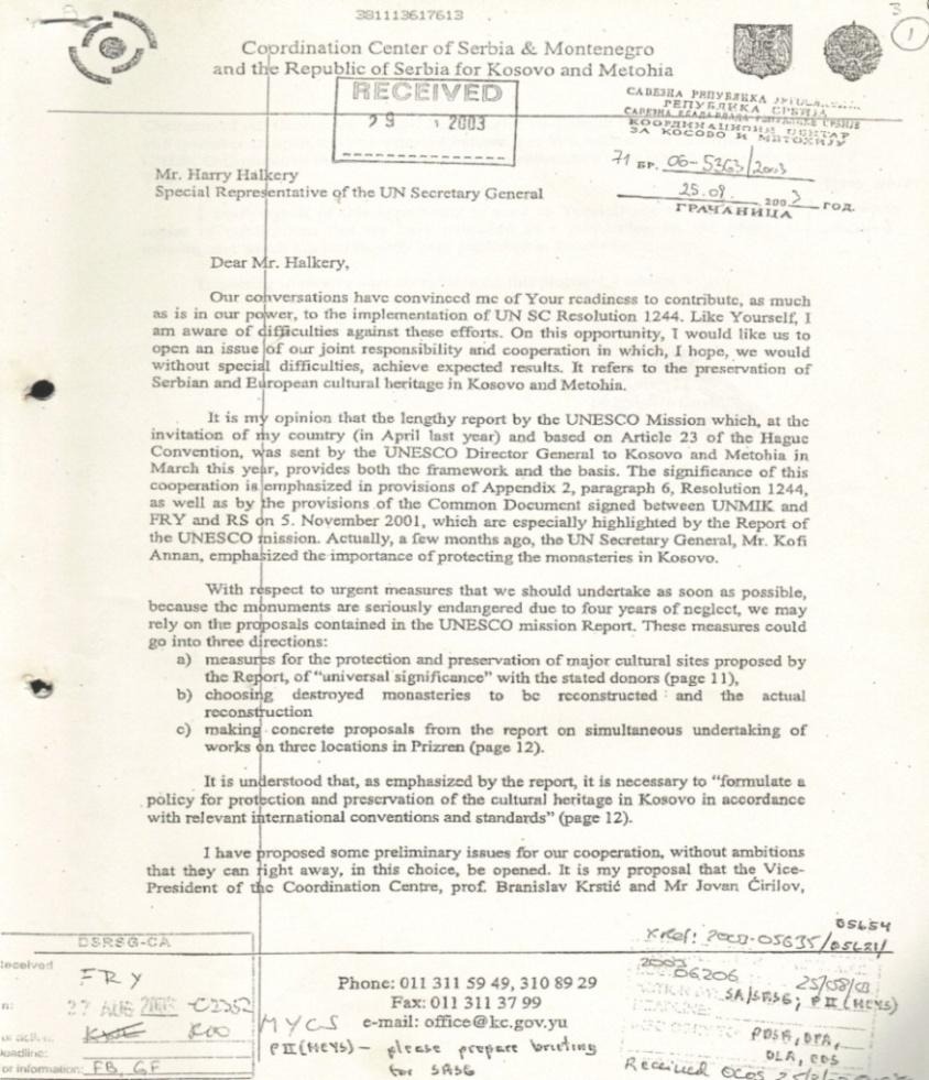Based on document no. 06-5363/2003 dated 25.08.2003 issued by“Coordination Center of the Republic of Serbia and Montenegro for Kosovo and Metohija”, in Gracanica and signed by its president, Nebojša Ćović, addressed to the Special Representative of the United Nations Secretary-General in Kosovo (UNMIK), Harry Halkery, among other things, requests:“that the Vice President of the Coordination Center, Prof. Branislav Krstic, and Mr. Jovan Cirilov, Chairman of the UNESCO Committee of this center, visit Pristina in early September 2003, to begin cooperation”Nebojša Čović wrote at the end of the letter:“took this opportunity to send you and Mr. Brayshaw a copy of our publication, which has recently been published by our UNESCO mission.”.Below we present the document drafted by Nebojsh Ćović, sent to Mr. Harry Holkery.