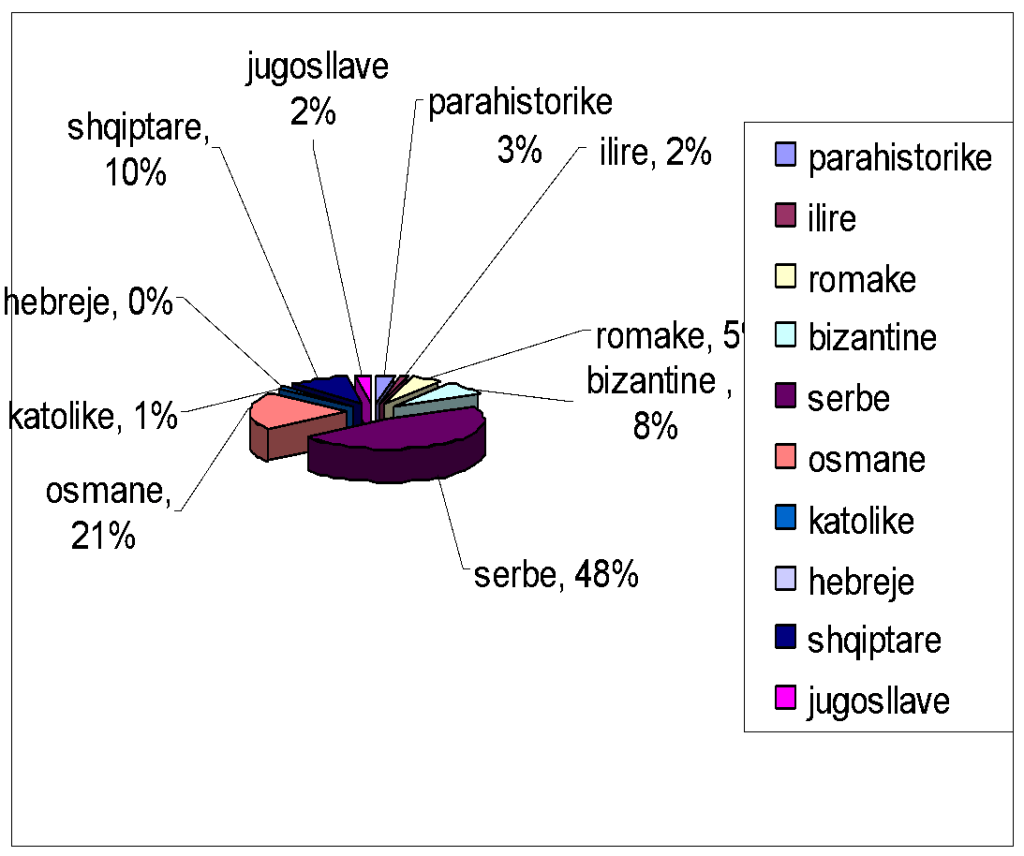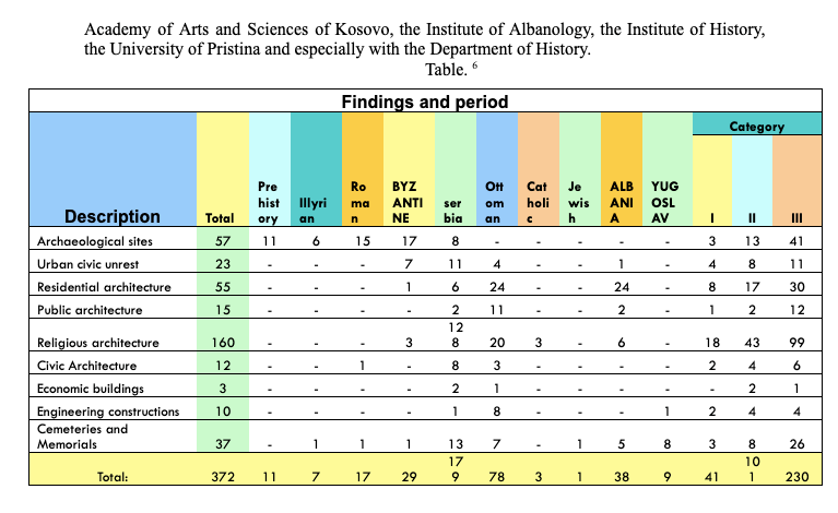 From this table it is clear what scientific approach they have taken to the protection of monuments: Falsification of historical facts; appropriation of Byzantine, Arbëro, Ottoman and other period monuments; deliberate destruction of prehistoric, Dardano-Illyrian, Roman, Byzantine, Illyrian-Arbëro heritage and in particular the heritage of folk architecture of the 18th-20th centuries.