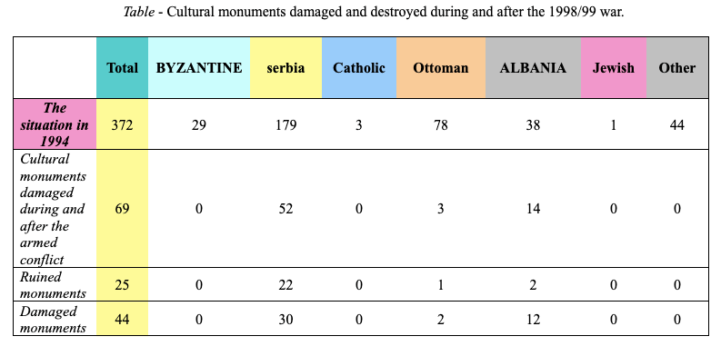 Table – Cultural monuments damaged and destroyed during and after the 1998/99 war.