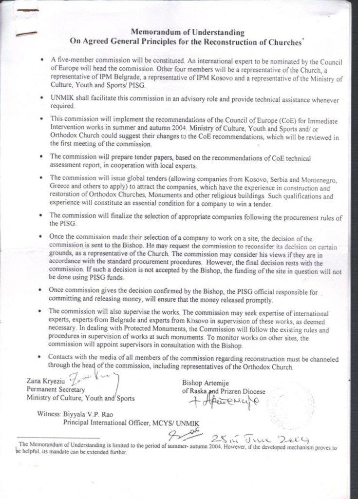 Memorandum of Understanding in Accordance with the General Principles for the Reconstruction of Churches.-The Ministry of Culture, Youth and Sports, the Provisional Institutions of Self-Government (“PISG”) and the Serbian Orthodox Church (SOC), in June 2004, regarding the undertaking of urgent measures in churches and other entities and objects of the Serbian Orthodox religion, damaged in March 2004. The Provisional Institutions of Self-Government (PISG) and the Serbian Orthodox Church (SOC), agree to resume the reconstruction process as follows: