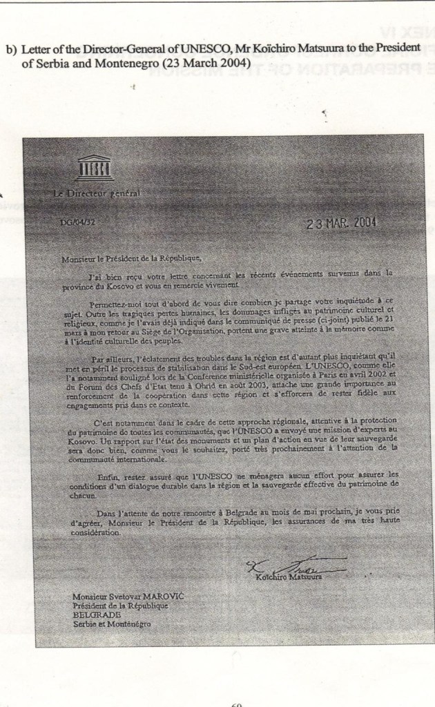 In addition to numerous protests and propaganda material from the Serbian Orthodox Church (SOC), following these events of March 17, 2004, the President of Serbia and Montenegro, Mr. Svetozar Marković, on March 19, sent a letter to the Director General of UNESCO, Mr. Koichiro Matsuura.