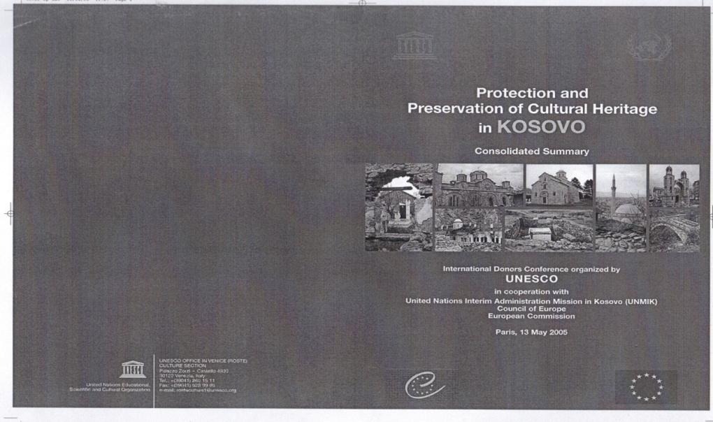 International Donor Conference, organized by UNESCO, in cooperation with the United Nations, the UNMIK Administrative Mission in Kosovo, the Council of Europe and the European Commission, for the preservation and conservation of cultural heritage monuments in Kosovo, organized in 2004, and published in a book in 2005.