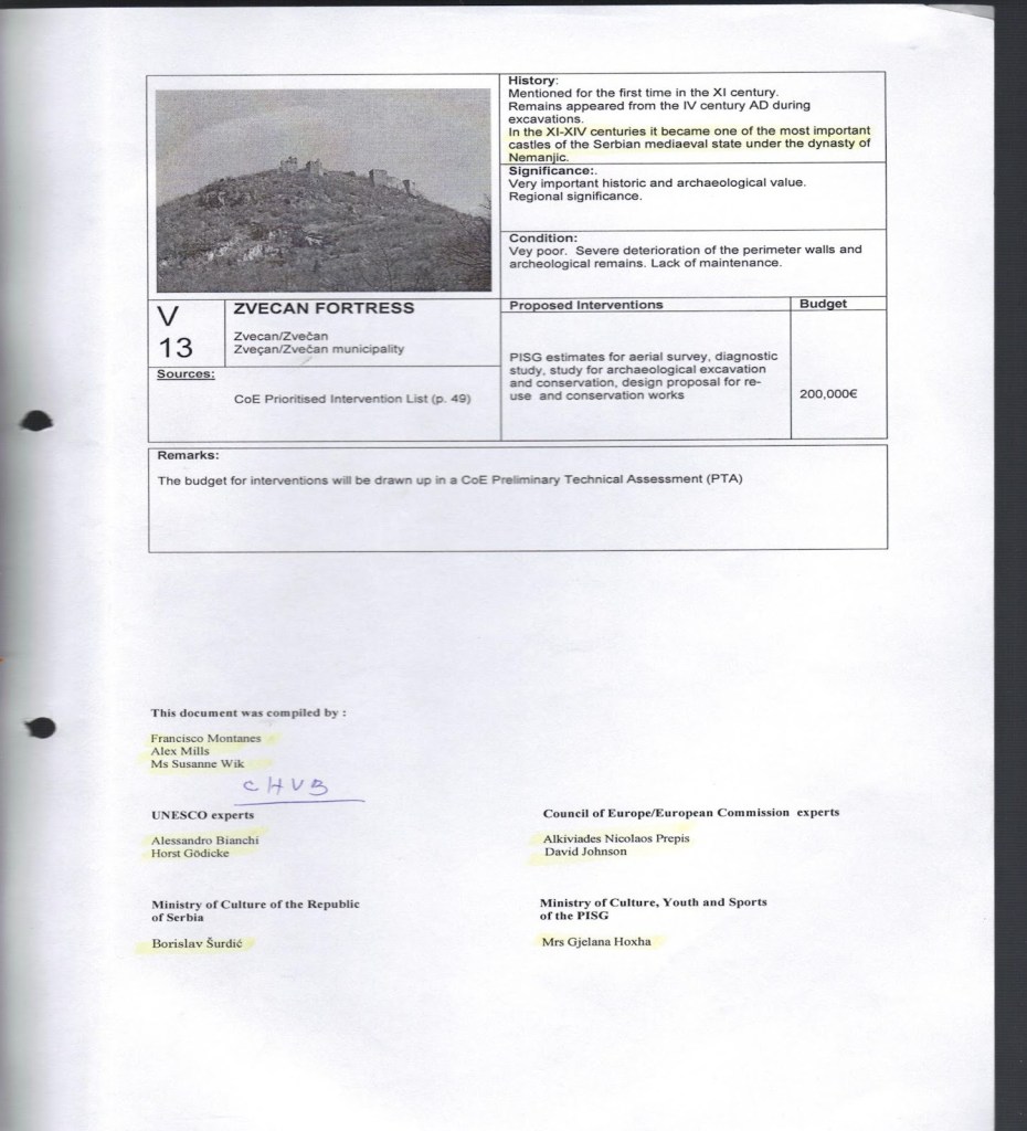 The data for all these monuments were compiled in a document by international and local experts, such as: from CHwB, Sweden: Francisco Mondanes, Alex Mills and Ms. Susanne Wik, UNESCO experts: Alessandro Bianchi, and Horst Godicke, from the Council of Europe and the European Commission experts: Alkiviades Nicolaos Prepis and David Johnson, from the Ministry of Culture of the Republic of Serbia: Borislav Surdić, and from the Ministry of Culture, Youth and Sports Ms. Gjejlane Hoxha.