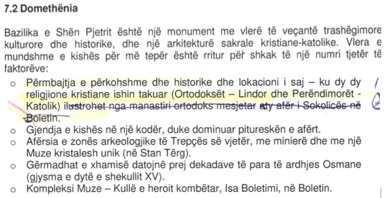 The authors who drafted this document also write that in this location the Christian religions, Orthodox and Catholic, meet. This information is very harmful for the history of the indigenous Albanian population, when now we have abundant data and it has been documented with numerous historical sources the presence of the Albanian Catholic community in the easternmost cities of Dardania, such as: in Nish, in Prokuplje, in Vrajë, in Leskoc etc, but also the presence of churches and this very powerful community in the area of Artana, Trepça and other medieval cities that at that time also had Catholic communes established in these cities.