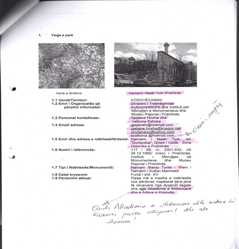 – Documents titled The Great Turkish Bath in Pristina, described in 2009 by international expert Mr. David Johnson