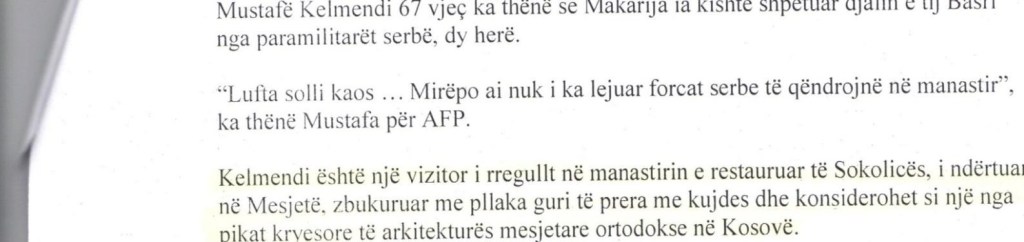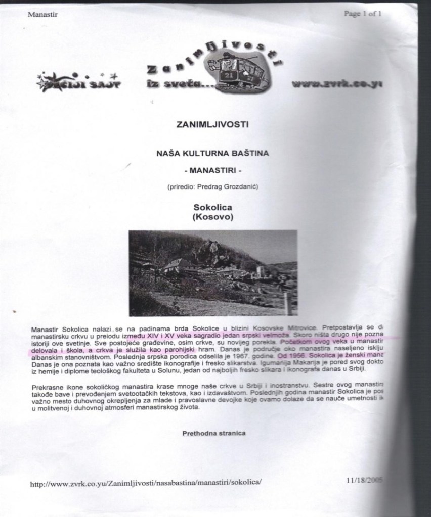 The article ends with a sentence, where it provides information about the restored monastery of Sokolica, supposedly built in the Middle Ages, decorated with carefully cut stone slabs, and considers it one of the highlights of medieval Orthodox architecture in Kosovo!