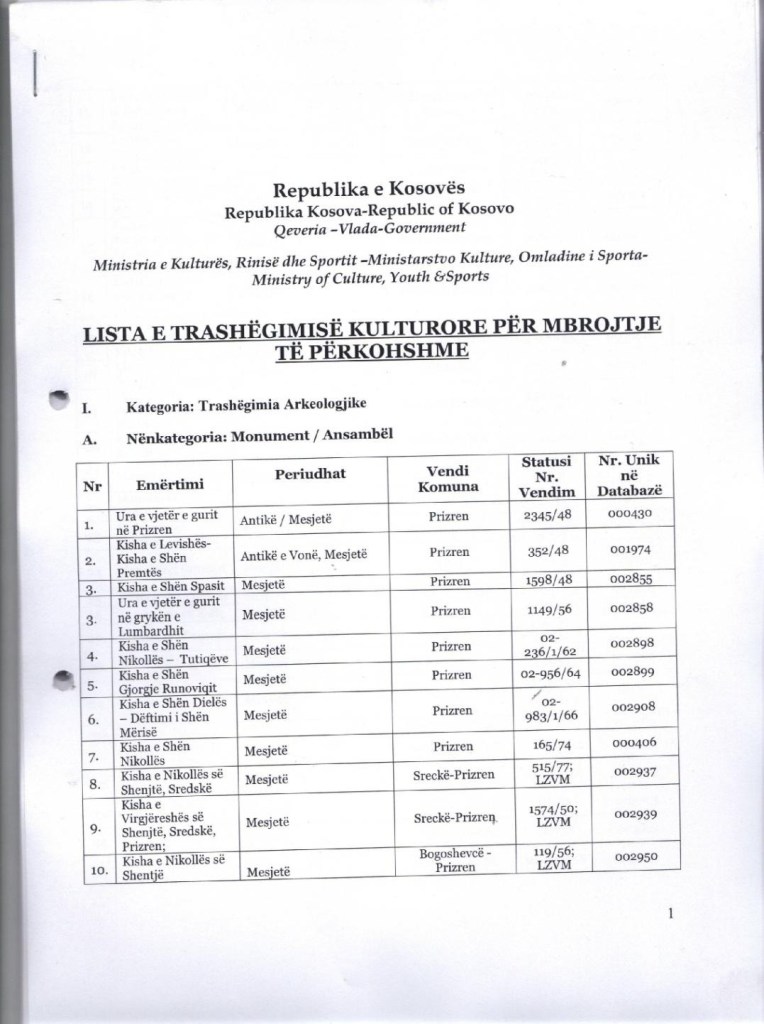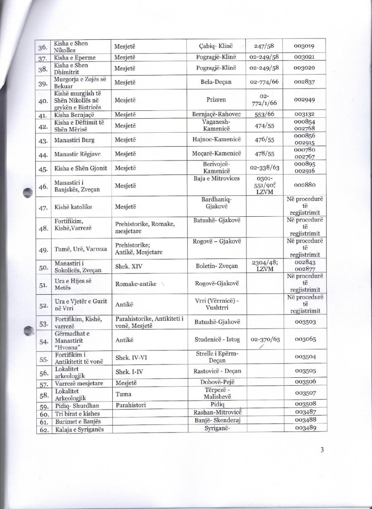The data compiled and presented in this list were sent to the Council of Europe, although there were major errors in it and the evaluation of the monuments was done without taking into account any professional and scientific criteria. We should emphasize that for example, regarding the Sokolica Monastery, even in Serbian literature and sources, Serbian authors themselves testify that this cult object only began to be called a“Monastery and Grave”.