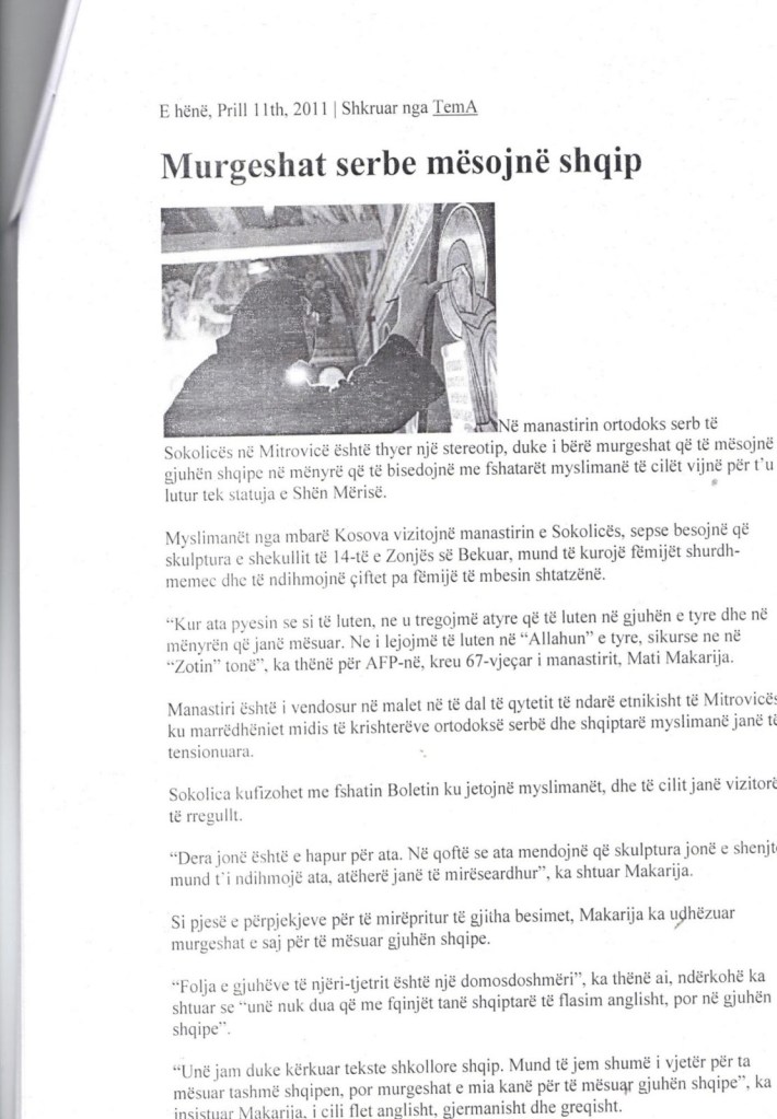We offer evidence from the article about the Sokolic Monastery: Serbian nuns learn Albanian, in the newspaper “Tema” in Tirana.