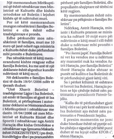– Statement by Xhavit Boletini, given to journalist Artan Behrami, “Express” newspaper, article, Between the Church and the Boletini, July 25, 2006