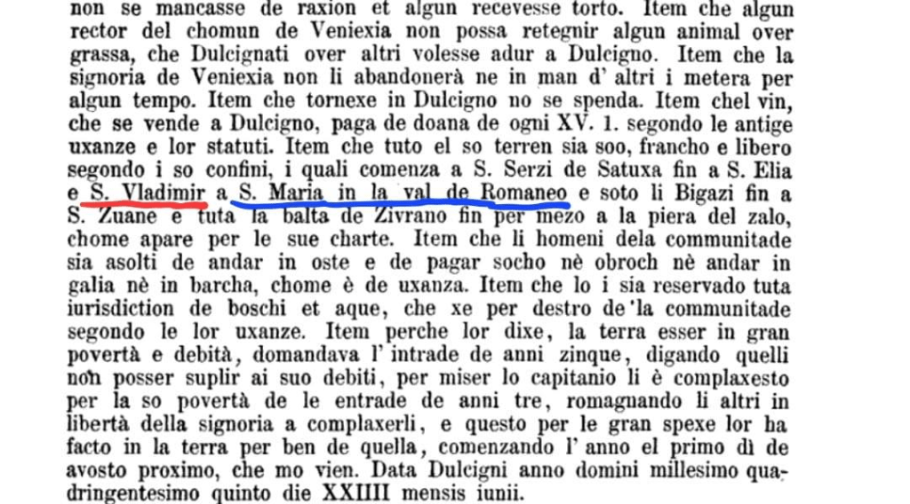 It is first mentioned in two Venetian documents of the 15th century, namely on September 13, 1406 and November 11, 1426, as S. Vladimiro on the border between the District of Ulcinj and the District of Shkodra, but without its precise geographical location (photos 2 and 3).