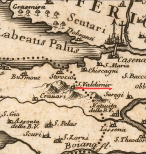 From the cartographic materials we have the cartographer Giacomo Giovanni Rossi, who in 1689 among other toponyms of Anësmal also presents the place S. Valdimir (Saint Vladimir) which geographically seen from Ulcinj represents the Mountain of Sumës. (photo 5)