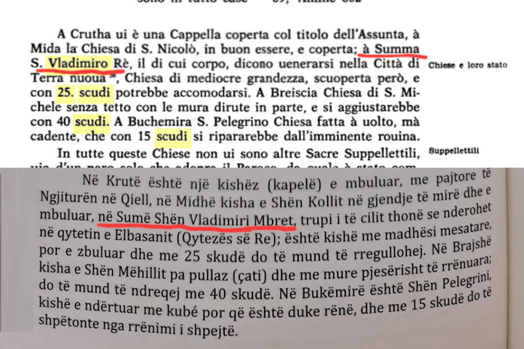 About the existence of this church on the top of Mount Suma (or Brejsha) several documents have been published so far that textually and geographically mention it at the Top of Mount Suma. Today, the church of Vladimir is mistakenly considered at the Top of Rumia. Below we are listing the relevant documents, as well as the evidence from Bogdani’s report.
