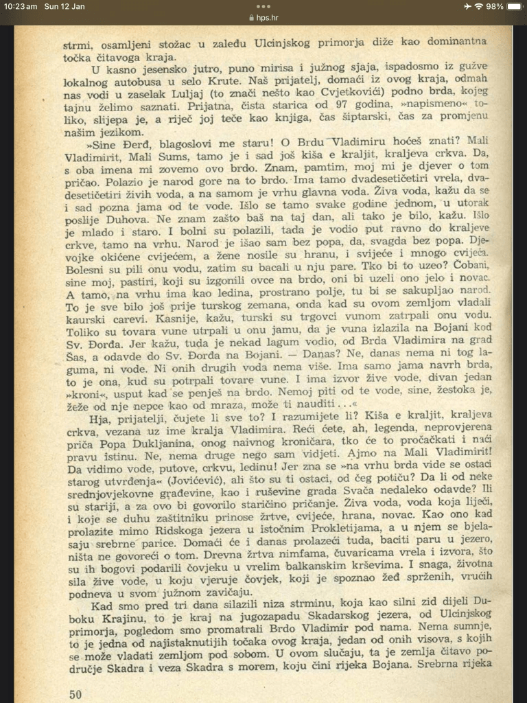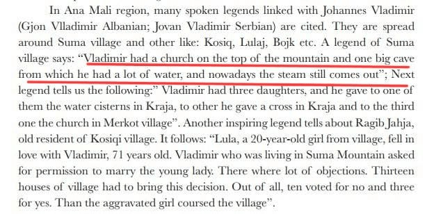 In 1960, the Croatian ethnographer Marijana Gušić recorded from a 90-year-old woman from the village of Lulaj (between Millë and Sumë) a “legend” about King Vladimir, the religious procession and the church on the mountaintop (photo 7). In other words, the inhabitants of Anamala in the 20th century still had the exploits of this medieval king/saint recorded in their memory, an important document that proves the Albanian origin of Vlad the Good (Vladimir).