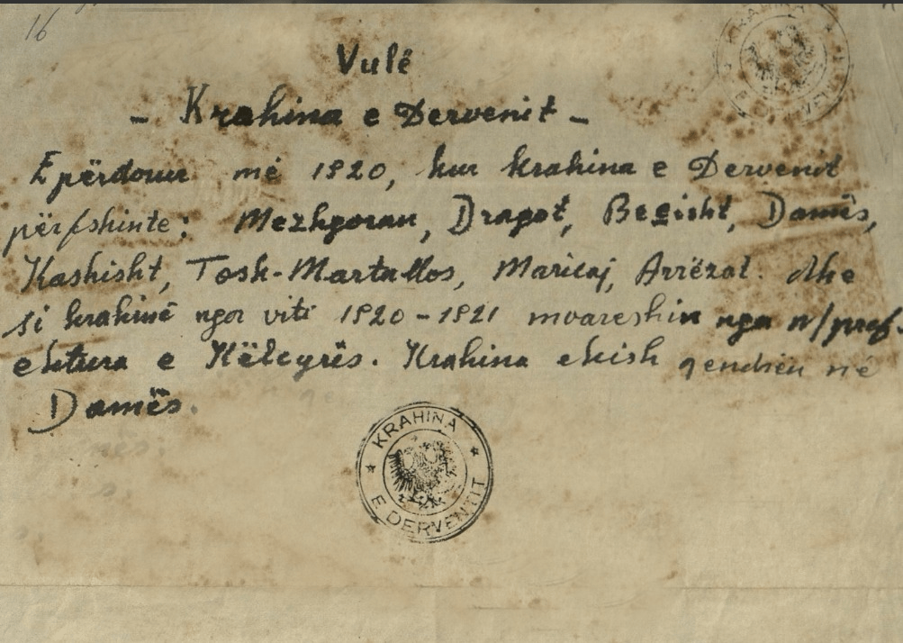 In 1919-21 Dervenit was a region dependent on the Kelcyra subprefecture. This region, with Damsin as its center, also included Shalesi. After the Kelcyra subprefecture was abolished, the Derven region passed under the subprefecture of Tepelena.