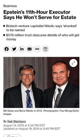 “Another tie to the cabal is Boris Nikolic, a Serbian physician and associate of Jeffrey Epstein who was on the board of scientific advisor for the Bill and Melinda Gates Foundation. Boris was given the power to execute Epstein’s will 2 days before he died.”