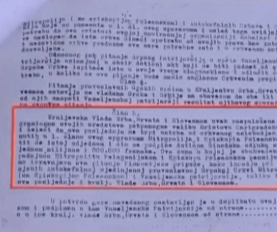 “Doctor of Historical Sciences Zvezdan Folić presents a document on how the Kingdom of Karađorđević bribed the Ecumenical Patriarchate for 1.5 million francs in 1920, in order to obtain a tomos and establish the Serbian Orthodox Church. A church with the name Serbian Orthodox Church never existed before 1920, not in any document, not in any seal.“
