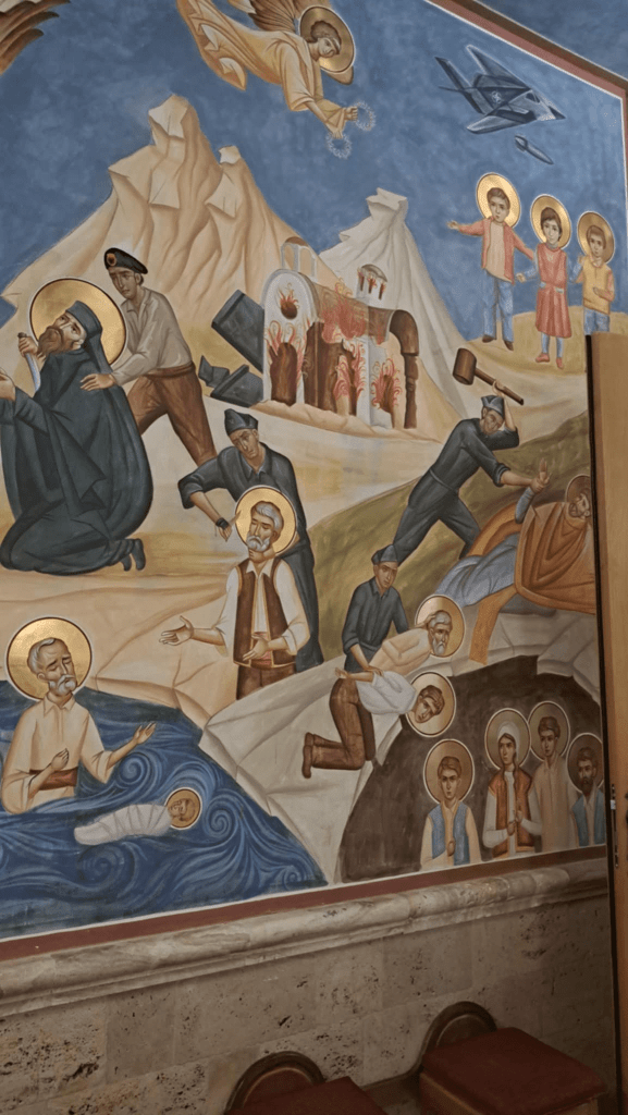 According to critics, the murals depict Serbs—particularly clergy and children—as pure and sanctified victims, while portraying Muslims and Kosovo Albanian fighters as brutal perpetrators of atrocities, including graphic violence against civilians. Additional scenes reportedly place figures such as Josip Broz Tito, Karl Marx, and Friedrich Engels in hellish imagery, reinforcing an overtly ideological and exclusionary message.