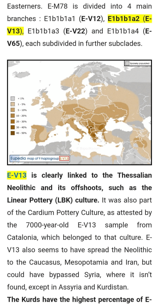 E-V13 emerged from E-M78, when Neolithic farmers were advancing in the Balkans and the Danubian basin and spread far beyond the borders of Europe to the eastern edge of the Mediterranean, the Caucasus, Kurdistan, Iran and even Siberia, since 6000 BC.