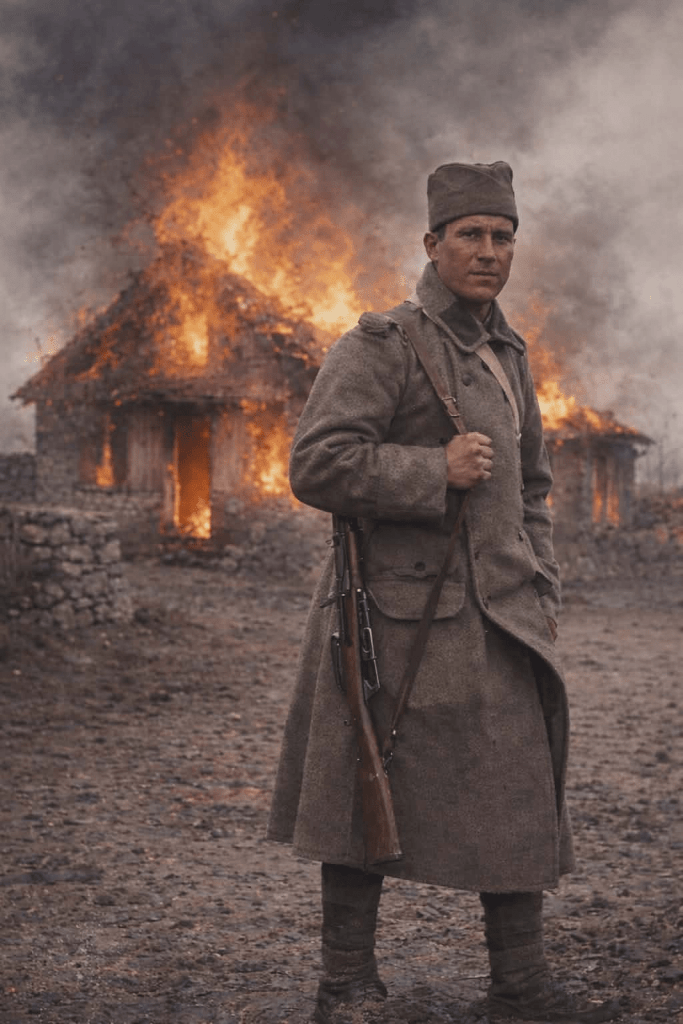 As the family—including the mother, father, and their infant child—was forced to stand outside their modest home, the soldiers began their grim work. They stuffed the house with dry hay, turning the family’s shelter into a makeshift pyre.
